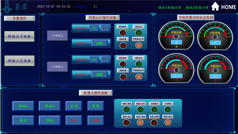 正常生产时操作人员无需对机器人做任何操作,只需要在触摸屏界面中正确的填写要焊接工件的尺寸相关参数,在操作面板上按一下启动按钮,机器人将会自动生成程序,按照既定的焊接顺序完成工件的焊接。当焊接工件有变化时,对应的焊接参数有相应的调整,机器人自动调取相应的数据库,焊接参数会根据相关界面中设置的板厚和焊脚大小要求,自动在数据库中调用相应的参数。